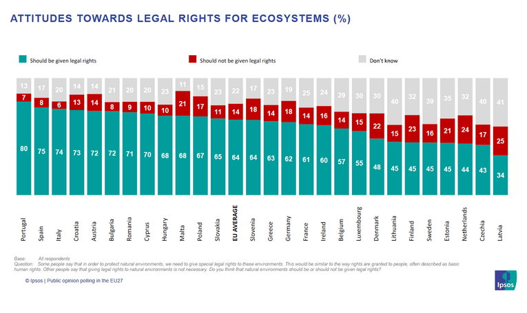 Fast zwei Drittel (64%) der Befragten sprachen sich dafür aus, dass Ökosysteme Rechte erhalten. Hinter dieser Durchschnittszahl verbergen sich jedoch große Unterschiede zwischen den Mitgliedstaaten, die von einem Tiefstand von 34 % in Lettland bis zu einem Höchststand von 80 % in Portugal reichen. Frankreich liegt mit 61% der Befragten im europäischen Durchschnitt.