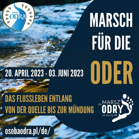 Osoba ist polnisch und bedeutet Person. Osoba Odra  bedeutet also "Person Oder". Unter diesem Namen findet vom 20. April bis zum 3. Juni 2023 ein Marsch für die Oder statt. Er beginnt an der Quelle der Oder in Tschechien, folgt dem Lauf des Flusses bis zur Mündung im Stettiner Haff führt. Das Bündnis hofft auf viele TeilnehmerInnen an den insgesammt 44. Etappen. Es möchte mit dem Odermarsch auf seine Forderung aufmerksam machen, der Oder den Rechtsstatus einer Person zu verleihen. Beata Bilska, Vorstandsmitglied grünen Partei Polens: "Wir sind eine Familie. Die Oder gehört dazu. Ein Familienmitglied lässt man nicht im Stich, wenn es leidet.“ Der Marsch für die Oder wird am 24. Mai 2023 in Höhe des Oderbruchs erwartet. Alle Informationen zum Odermarsch finden finden Sie hier. Es besteht die Möglichkeit an einer Unterschriftensammlung mitzumachen.